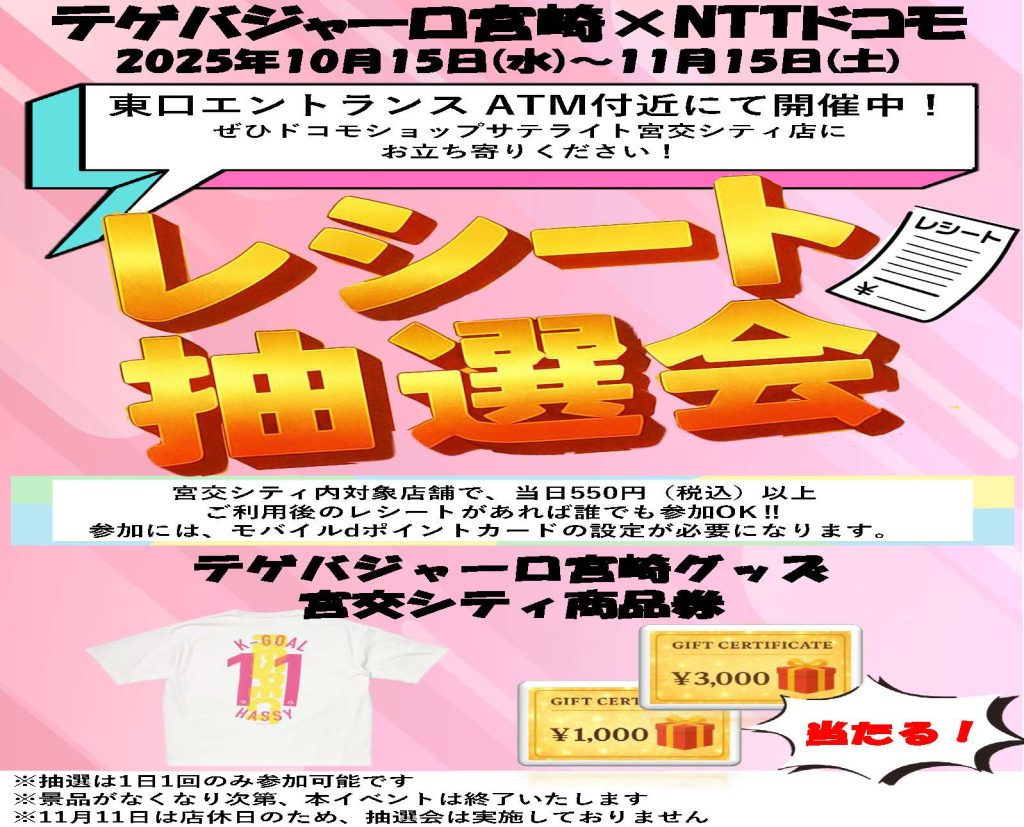 10月15日㈬~11月15日㈯「テゲバジャーロ宮崎×NTTドコモ特別企画!レシート抽選会」開催!!