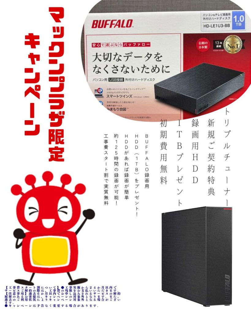 今トリプルチューナーを新規ご契約いただくと特典としてBUFFALOの録画用ハードディスク1TBを1台プレゼント!